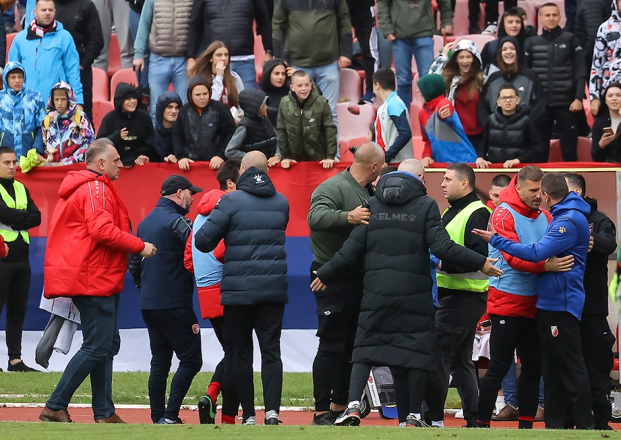 Naredno uzbuđenje desilo se u 69. minutu, ali nije bilo na terenu. Desio se sukob između dve klupe, u raspravi su učestvovali čak i Bandović i Dudić, a sve se završilo crvenim kartonima za njihove članove stručnog štaba.